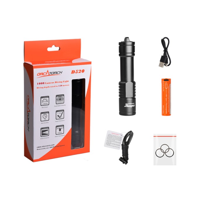 OrcaTorch D520 to kompaktowa, mocna i niezawodna latarka nurkowa o jasności 1000 lm, z wąską wiązką 14° i zasilaniem 18650/CR123A. Prosty mechaniczny przełącznik i szczelność IPX8 czynią ją doskonałym wyborem jako główna lub backupowa latarka do 150 m.