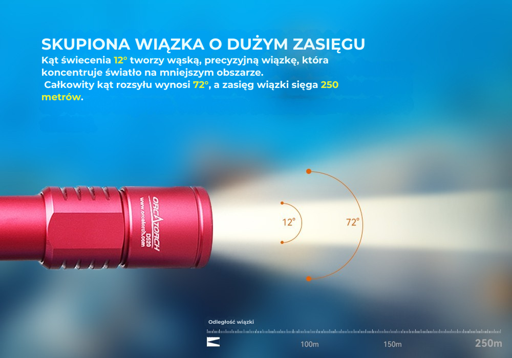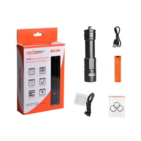 Latarka nurkowa OrcaTorch D520 to kompaktowa i wyjątkowo niezawodna latarka o mocy 1000 lumenów z wąskim, precyzyjnym kątem wiązki 14°. Dzięki zasilaniu akumulatorem 18650 (lub dwoma bateriami CR123A), prostemu w obsłudze mechanicznemu przełącznikowi obrotowemu oraz szczelności IPX8 / 150 m, D520 jest jednym z najpopularniejszych wyborów dla nurków rekreacyjnych i technicznych. Solidny korpus z aluminium A6061-T6 i hartowane szkło zapewniają trwałość w każdych warunkach.
