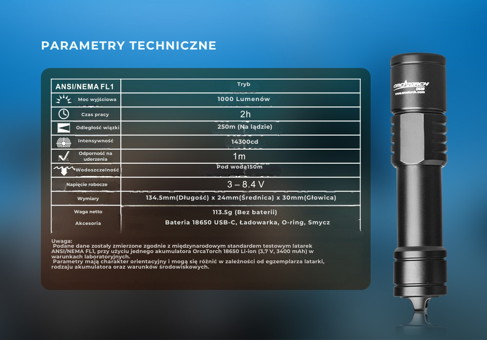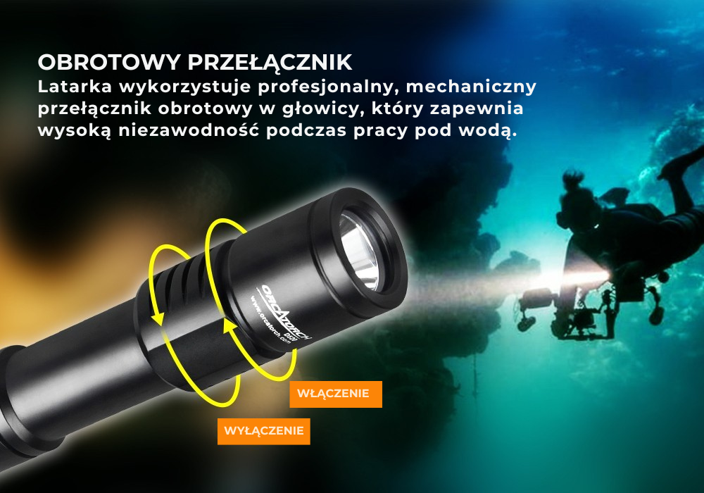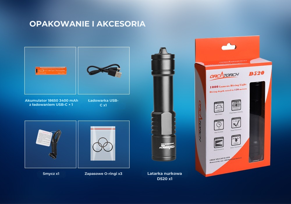 Latarka nurkowa OrcaTorch D520 Black – 1000 lm, akumulator 18650, mechaniczny włącznik, głębokość 150 m