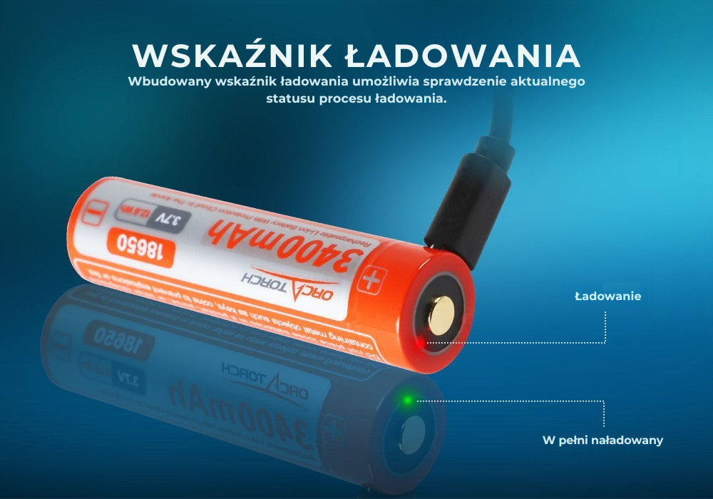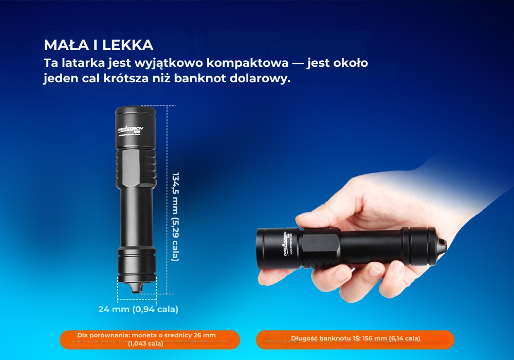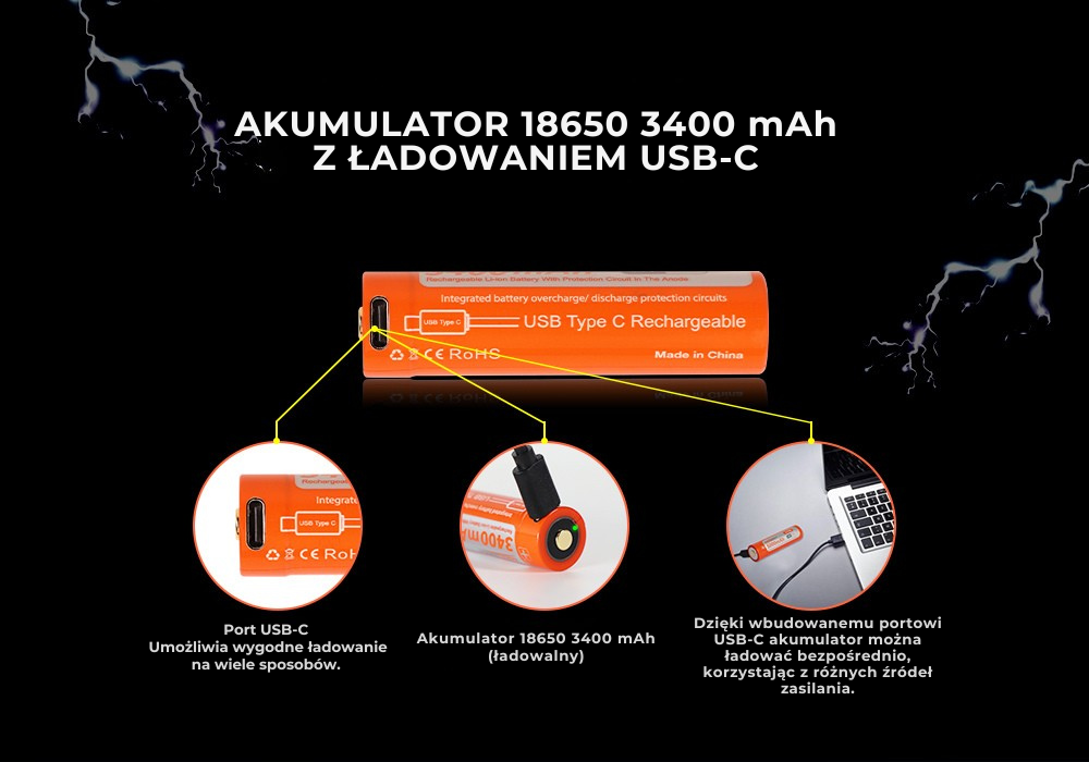 O: 1× 18650 lub 2× CR123A. Rekomendowane są ogniwa 18650 wysokiej jakości.