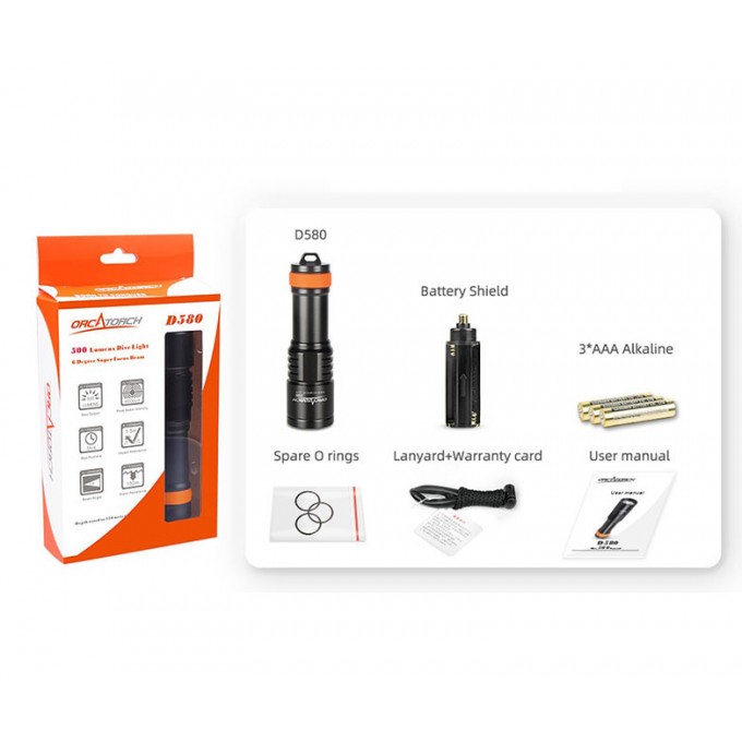 OrcaTorch D580 — solidna, szczelna latarka 530 lm z wyborem zasilania 18650/3×AAA, wiązką 6° i przełącznikiem obrotowym. Gotowa na lata nurkowań.