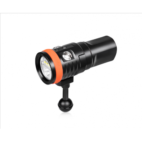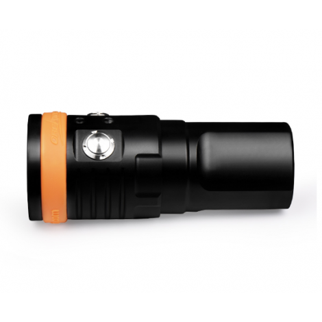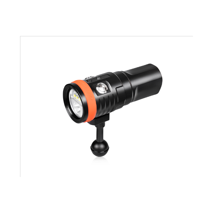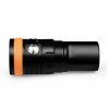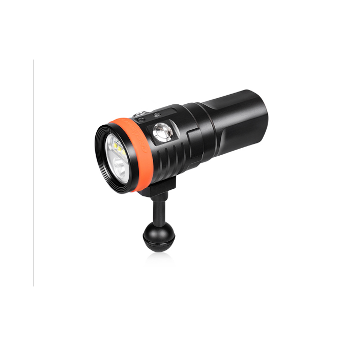 Latarka nurkowa foto OrcaTorch D900V to wszechstronna lampa łącząca funkcję światła głównego oraz oświetlenia do kamery lub aparatu podwodnego. Oferuje cztery tryby barw: neutralną biel 120°, zimną biel 8°, światło czerwone i UV. Zastosowany system szybkiego ładowania magnetycznego eliminuje potrzebę wyjmowania akumulatora, a moc 2200 lumenów gwarantuje doskonałą widoczność w każdej sytuacji.