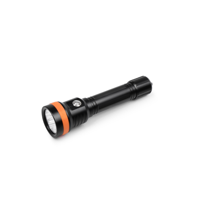 OrcaTorch D850 to kompaktowa, mocna latarka nurkowa o mocy 2500 lumenów i kącie wiązki 6°. Wyposażona w 5 diod LED oraz optykę zapewniającą długą wiązkę światła, D850 sprawdza się podczas nurkowań rekreacyjnych i technicznych. Boczny tytanowy przycisk z blokadą gwarantuje łatwą obsługę i bezpieczeństwo, a wbudowany wskaźnik baterii informuje o pozostałym czasie pracy.