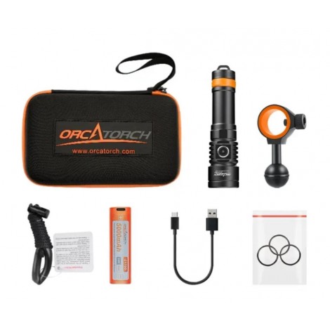 Latarka nurkowa foto OrcaTorch D710V MK2 – 2300 lm, 3 kolory (białe/czerwone/UV), USB-C w akumulatorze 21700, głębokość 150 m.