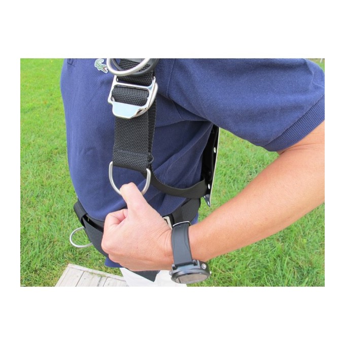 - Regulowane pasy naramienne z metalowymi klamrami – możliwość dopasowania do sylwetki i suchego/piankowego skafandra.