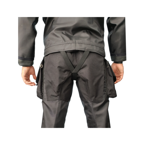 Skafander wyposażony jest w regulowaną gumę w części lędźwiowej, umożliwiającą precyzyjną regulację obwodu talii w przypadku zmiany sylwetki użytkownika.